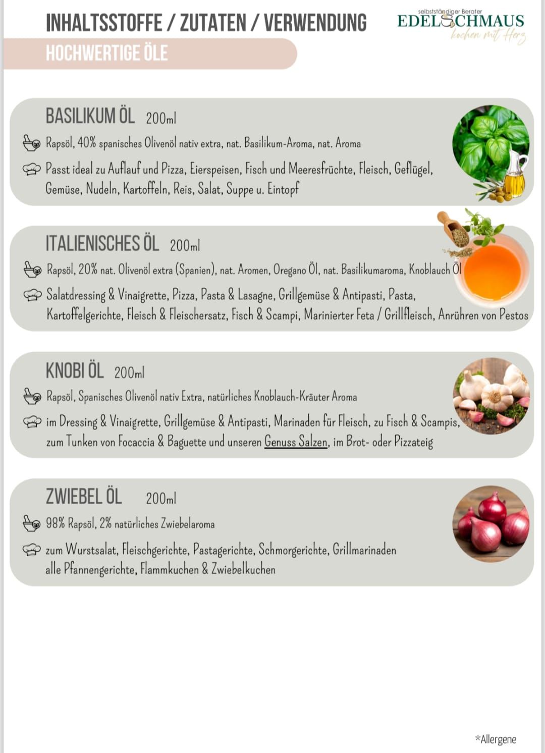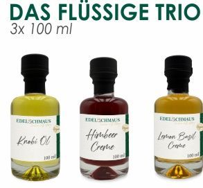 4 Sets bestehen jeweils aus 4 Gläsern und kosten jeweils 21,99€. Das flüssige Trio besteht, wie auf dem Foto zu sehen, aus drei je 100ml Flaschen Öl, ebenfalls für 21.99€