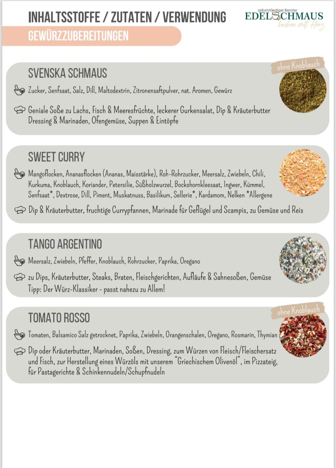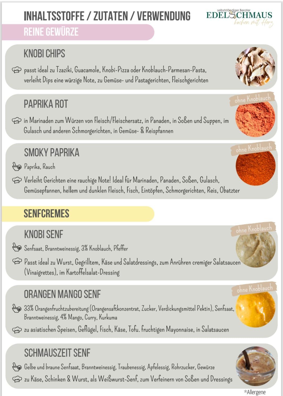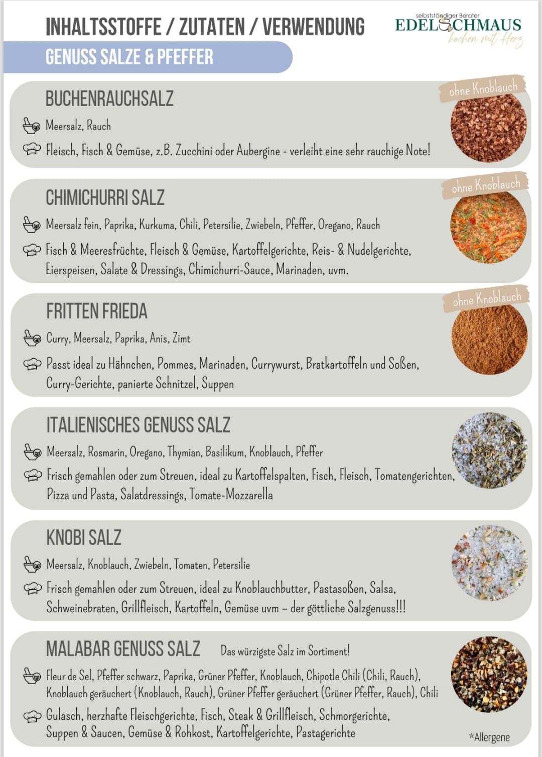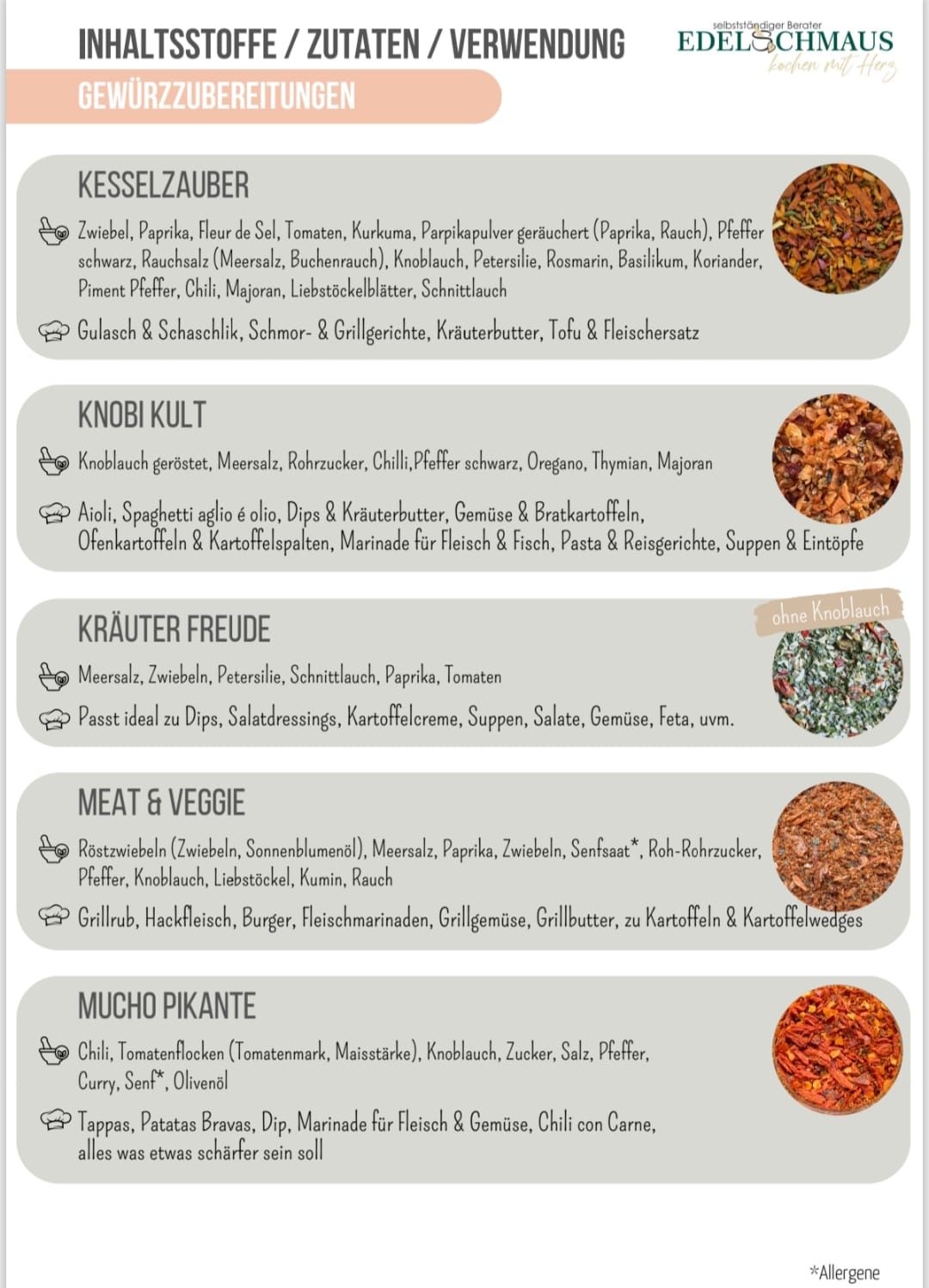Ebenfalls fest im Sortiment sind nun 5 Spar-Sets, „Feinschmecker“, „Genussreise“ sowie „süß und salzig“. Außerdem seit Oktober 2025 noch mit Dabei "4 YOUR BBQ" und "Das flüssige Trio".